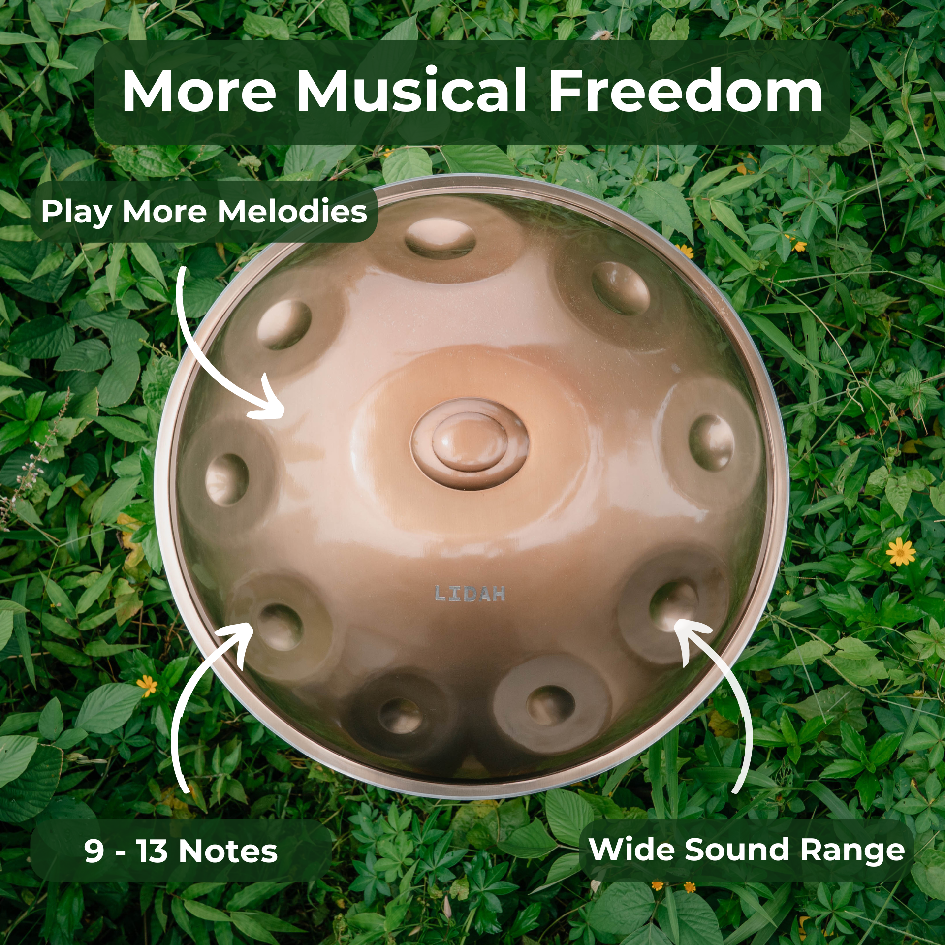 Our Essential Series Handpans have a 53 cm diameter and 9–13 notes, offering a wide range of expression while remaining intuitive to play, making them the most popular choice for beginners and intermediate players.