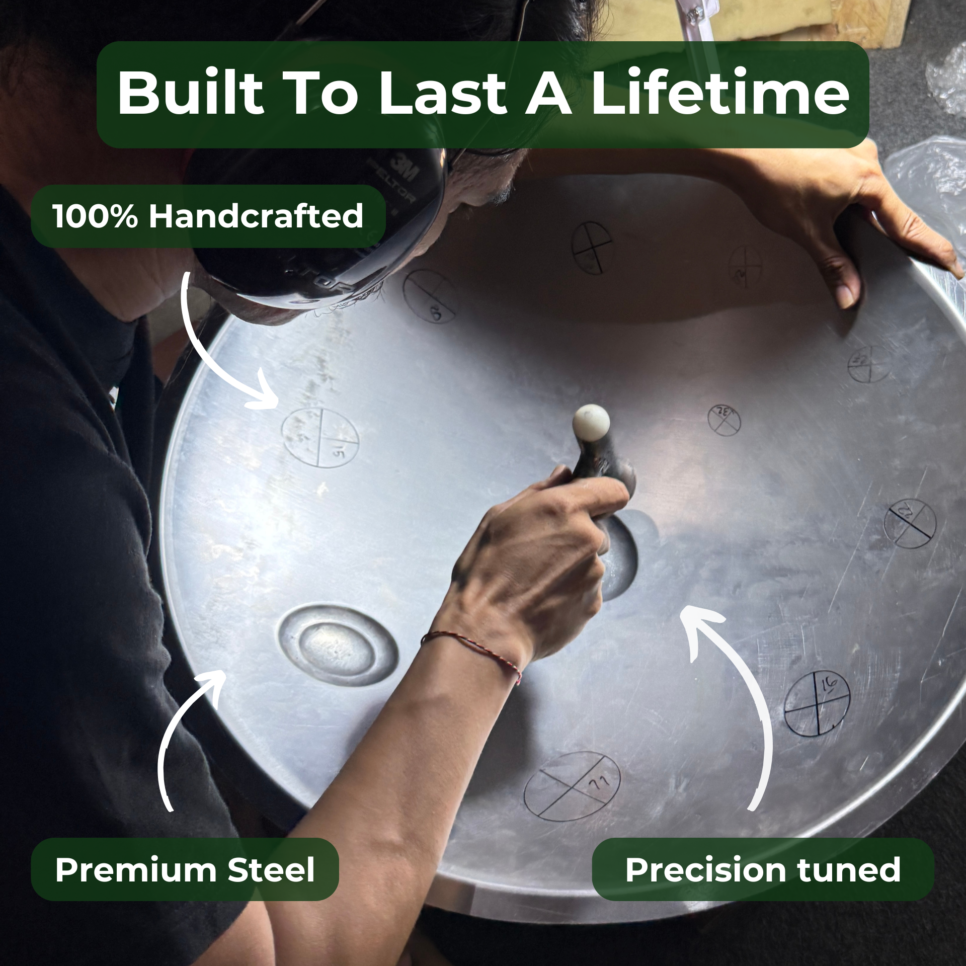 Each LIDAH handpan is carefully handcrafted in our workshop in Bali, using premium steel and multiple precise tuning rounds. Built for lasting sound, stability, and a premium playing experience, it is made to be enjoyed for years to come.