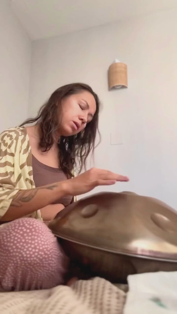 Women Sitting outside with LIDAH Handpan on her lap as the sun sets